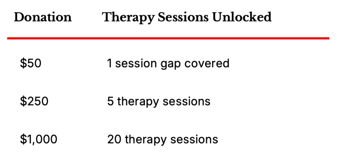 The therapist invoices MHI for the remaining cost. Individual and community donations cover the remainder of these fees.